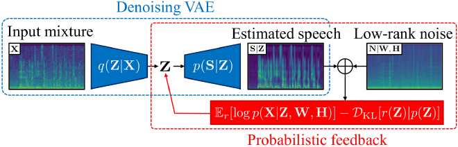 This paper presents a neural speech enhancement method that has a statistical feedback mechanism based on a denoising variational autoencoder (VAE). Deep generative models of speech signals have been combined with unsupervised noise models for enhancing speech robustly regardless of the condition mismatch from the training data. This approach, however, often yields unnatural speech-like noise due to the unsuitable prior distribution on the latent speech representations. To mitigate this problem, we use a denoising VAE whose encoder estimates the latent vectors of clean speech from an input mixture signal. This encoder network is utilized as a prior distribution of the probabilistic generative model of the input mixture, and its condition mismatch is handled in a Bayesian manner. The speech signal is estimated by updating the latent vectors to fit the input mixture while noise is estimated by a nonnegative matrix factorization model. To efficiently train the encoder network, we also propose a multi-task learning of the denoising VAE with the standard mask-based enhancement. The experimental results show that our method outperforms the existing mask-based and generative enhancement methods in unknown conditions.